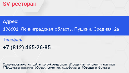 SV, ресторан по адресу 196601, Ленинградская область, Пушкин, Средняя, 2а в дальнейшем Организация, размещена в следующих категориях: