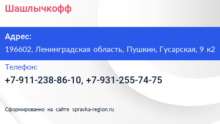 Шашлычкофф по адресу 196602, Ленинградская область, Пушкин, Гусарская, 9 к2 в дальнейшем Организация, размещена в следующих категориях: