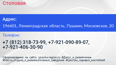 Столовая по адресу 196601, Ленинградская область, Пушкин, Московская, 20 в дальнейшем Организация, размещена в следующих категориях: