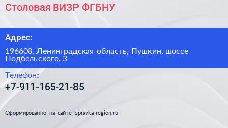Столовая, ВИЗР, ФГБНУ по адресу 196608, Ленинградская область, Пушкин, шоссе Подбельского, 3 в дальнейшем Организация, размещена в следующих категориях: