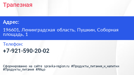 Трапезная по адресу 196601, Ленинградская область, Пушкин, Соборная площадь, 1 в дальнейшем Организация, размещена в следующих категориях:
