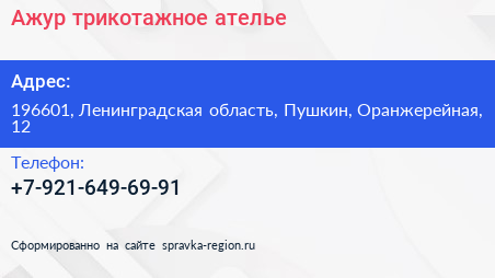 Ажур, трикотажное ателье по адресу 196601, Ленинградская область, Пушкин, Оранжерейная, 12 в дальнейшем Организация, размещена в следующих категориях: