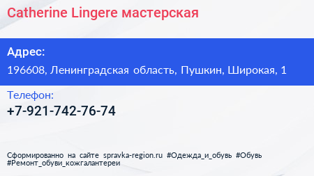 Catherine Lingere, мастерская по адресу 196608, Ленинградская область, Пушкин, Широкая, 1 в дальнейшем Организация, размещена в следующих категориях: