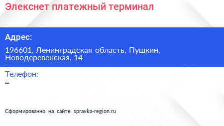 Элекснет, платежный терминал по адресу 196601, Ленинградская область, Пушкин, Новодеревенская, 14 в дальнейшем Организация, размещена в следующих категориях: