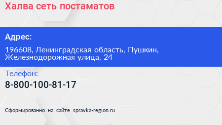 Халва, сеть постаматов по адресу 196608, Ленинградская область, Пушкин, Железнодорожная улица, 24 в дальнейшем Организация, размещена в следующих категориях: