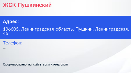 ЖСК Пушкинский по адресу 196605, Ленинградская область, Пушкин, Ленинградская, 46 в дальнейшем Организация, размещена в следующих категориях: