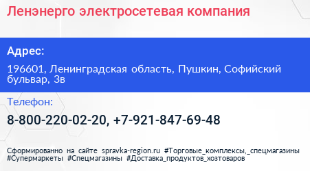 Ленэнерго, электросетевая компания по адресу 196601, Ленинградская область, Пушкин, Софийский бульвар, 3в в дальнейшем Организация, размещена в следующих категориях: