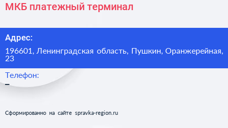 МКБ, платежный терминал по адресу 196601, Ленинградская область, Пушкин, Оранжерейная, 23 в дальнейшем Организация, размещена в следующих категориях: