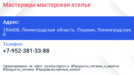 Мастерицы, мастерская-ателье по адресу 196608, Ленинградская область, Пушкин, Ленинградская, 8 в дальнейшем Организация, размещена в следующих категориях: