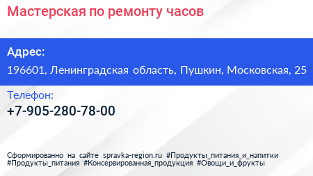 Мастерская по ремонту часов по адресу 196601, Ленинградская область, Пушкин, Московская, 25 в дальнейшем Организация, размещена в следующих категориях: