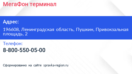 МегаФон, терминал по адресу 196608, Ленинградская область, Пушкин, Привокзальная площадь, 2 в дальнейшем Организация, размещена в следующих категориях: