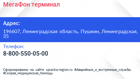 МегаФон, терминал по адресу 196607, Ленинградская область, Пушкин, Ленинградская, 35 в дальнейшем Организация, размещена в следующих категориях: