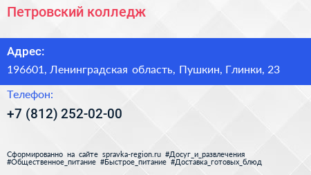 Петровский колледж по адресу 196601, Ленинградская область, Пушкин, Глинки, 23 в дальнейшем Организация, размещена в следующих категориях: