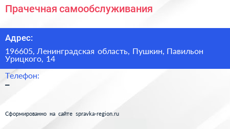 Прачечная самообслуживания по адресу 196605, Ленинградская область, Пушкин, Павильон Урицкого, 14 в дальнейшем Организация, размещена в следующих категориях: