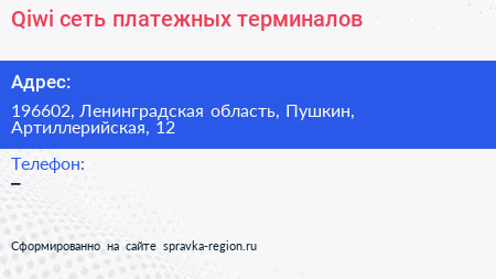 Qiwi, сеть платежных терминалов по адресу 196602, Ленинградская область, Пушкин, Артиллерийская, 12 в дальнейшем Организация, размещена в следующих категориях:
