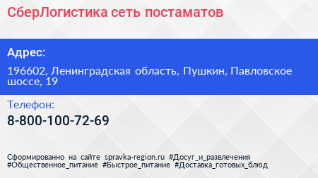 СберЛогистика, сеть постаматов по адресу 196602, Ленинградская область, Пушкин, Павловское шоссе, 19 в дальнейшем Организация, размещена в следующих категориях: