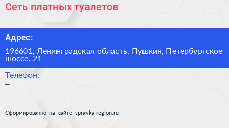 Сеть платных туалетов по адресу 196601, Ленинградская область, Пушкин, Петербургское шоссе, 21 в дальнейшем Организация, размещена в следующих категориях: