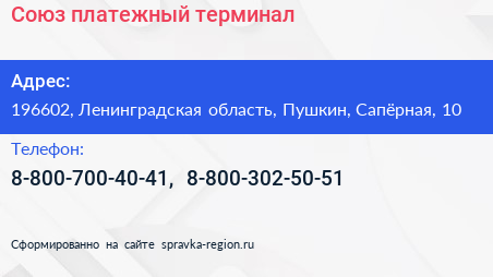 Союз, платежный терминал по адресу 196602, Ленинградская область, Пушкин, Сапёрная, 10 в дальнейшем Организация, размещена в следующих категориях: