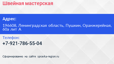 Швейная мастерская по адресу 196608, Ленинградская область, Пушкин, Оранжерейная, 60а лит А в дальнейшем Организация, размещена в следующих категориях: