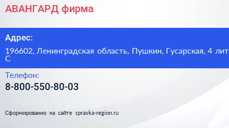 АВАНГАРД, фирма по адресу 196602, Ленинградская область, Пушкин, Гусарская, 4 лит С в дальнейшем Организация, размещена в следующих категориях: