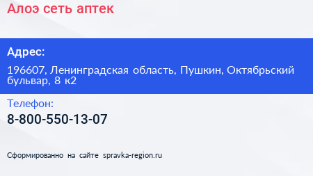 Алоэ, сеть аптек по адресу 196607, Ленинградская область, Пушкин, Октябрьский бульвар, 8 к2 в дальнейшем Организация, размещена в следующих категориях: