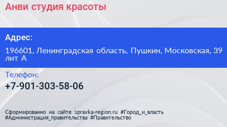 Анви, студия красоты по адресу 196601, Ленинградская область, Пушкин, Московская, 39 лит А в дальнейшем Организация, размещена в следующих категориях: