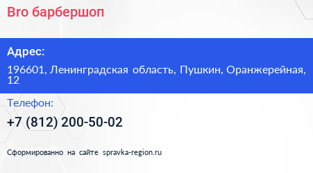 Bro, барбершоп по адресу 196601, Ленинградская область, Пушкин, Оранжерейная, 12 в дальнейшем Организация, размещена в следующих категориях: