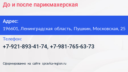 До и после, парикмахерская по адресу 196601, Ленинградская область, Пушкин, Московская, 25 в дальнейшем Организация, размещена в следующих категориях: