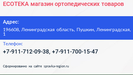 ECOTEKA, магазин ортопедических товаров по адресу 196608, Ленинградская область, Пушкин, Ленинградская, 1 в дальнейшем Организация, размещена в следующих категориях: