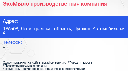 ЭкоМыло, производственная компания по адресу 196608, Ленинградская область, Пушкин, Автомобильная, 4 в дальнейшем Организация, размещена в следующих категориях: