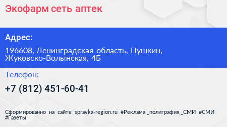 Экофарм, сеть аптек по адресу 196608, Ленинградская область, Пушкин, Жуковско-Волынская, 4Б в дальнейшем Организация, размещена в следующих категориях: