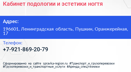 Кабинет подологии и эстетики ногтя по адресу 196601, Ленинградская область, Пушкин, Оранжерейная, 17 в дальнейшем Организация, размещена в следующих категориях: