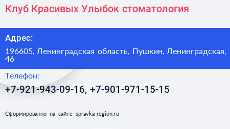 Клуб Красивых Улыбок, стоматология по адресу 196605, Ленинградская область, Пушкин, Ленинградская, 46 в дальнейшем Организация, размещена в следующих категориях: