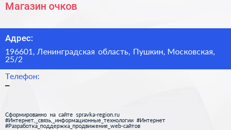 Магазин очков по адресу 196601, Ленинградская область, Пушкин, Московская, 25/2 в дальнейшем Организация, размещена в следующих категориях: