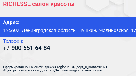 RICHESSE, салон красоты по адресу 196602, Ленинградская область, Пушкин, Малиновская, 17 в дальнейшем Организация, размещена в следующих категориях: