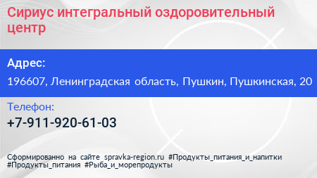 Сириус, интегральный оздоровительный центр по адресу 196607, Ленинградская область, Пушкин, Пушкинская, 20 в дальнейшем Организация, размещена в следующих категориях: