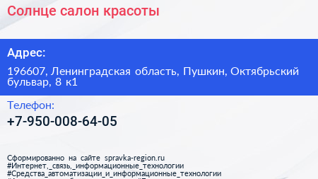 Солнце, салон красоты по адресу 196607, Ленинградская область, Пушкин, Октябрьский бульвар, 8 к1 в дальнейшем Организация, размещена в следующих категориях: