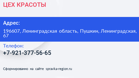 ЦЕХ КРАСОТЫ по адресу 196607, Ленинградская область, Пушкин, Ленинградская, 67 в дальнейшем Организация, размещена в следующих категориях: