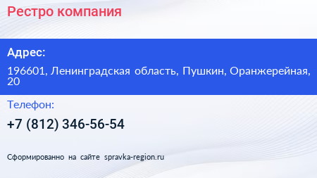 Рестро, компания по адресу 196601, Ленинградская область, Пушкин, Оранжерейная, 20 в дальнейшем Организация, размещена в следующих категориях: