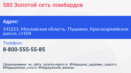 585*Золотой, сеть ломбардов по адресу 141211, Московская область, Пушкино, Красноармейское шоссе, ст104 в дальнейшем Организация, размещена в следующих категориях: