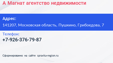 А-Магнат, агентство недвижимости по адресу 141207, Московская область, Пушкино, Грибоедова, 7 в дальнейшем Организация, размещена в следующих категориях: