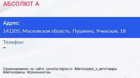 АБСОЛЮТ А по адресу 141205, Московская область, Пушкино, Учинская, 18 в дальнейшем Организация, размещена в следующих категориях: