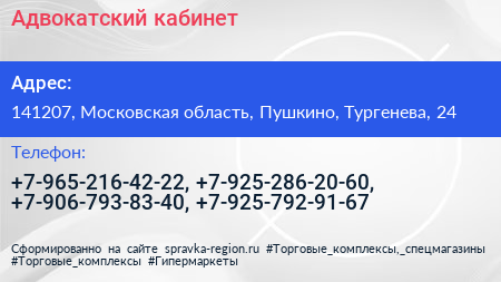 Адвокатский кабинет по адресу 141207, Московская область, Пушкино, Тургенева, 24 в дальнейшем Организация, размещена в следующих категориях: