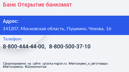 Банк Открытие, банкомат по адресу 141207, Московская область, Пушкино, Чехова, 16 в дальнейшем Организация, размещена в следующих категориях: