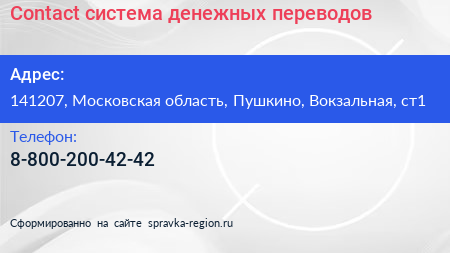 Contact, система денежных переводов по адресу 141207, Московская область, Пушкино, Вокзальная, ст1 в дальнейшем Организация, размещена в следующих категориях: