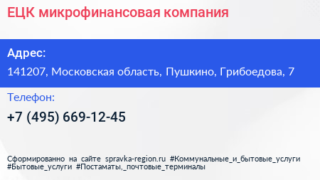 ЕЦК, микрофинансовая компания по адресу 141207, Московская область, Пушкино, Грибоедова, 7 в дальнейшем Организация, размещена в следующих категориях: