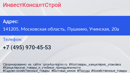 ИнвестКонсалтСтрой по адресу 141205, Московская область, Пушкино, Учинская, 20а в дальнейшем Организация, размещена в следующих категориях: