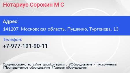 Нотариус Сорокин М.С. по адресу 141207, Московская область, Пушкино, Тургенева, 13 в дальнейшем Организация, размещена в следующих категориях: