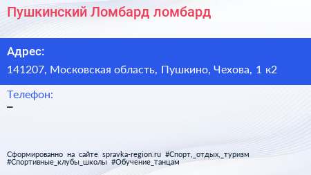 Пушкинский Ломбард, ломбард по адресу 141207, Московская область, Пушкино, Чехова, 1 к2 в дальнейшем Организация, размещена в следующих категориях: