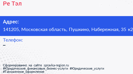 Ре-Тэл по адресу 141205, Московская область, Пушкино, Набережная, 35 к2 в дальнейшем Организация, размещена в следующих категориях: